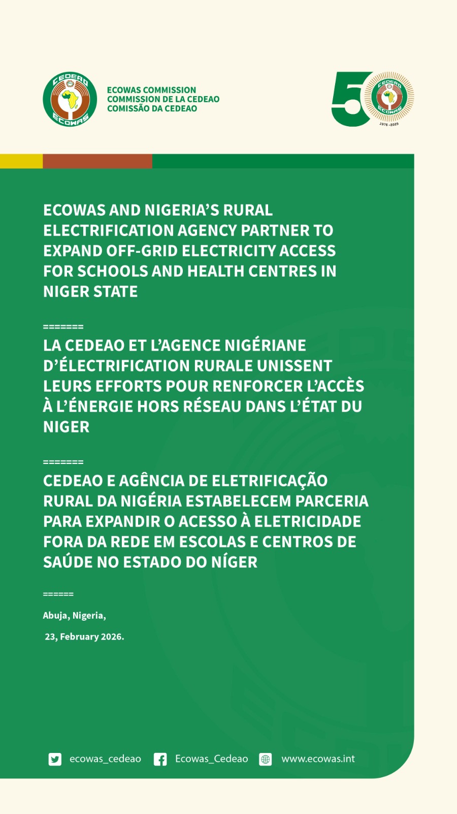 LA CEDEAO ET L’AGENCE NIGÉRIANE D’ÉLECTRIFICATION RURALE UNISSENT LEURS EFFORTS POUR RENFORCER L’ACCÈS À L’ÉNERGIE HORS RÉSEAU DANS L’ÉTAT DU NIGER